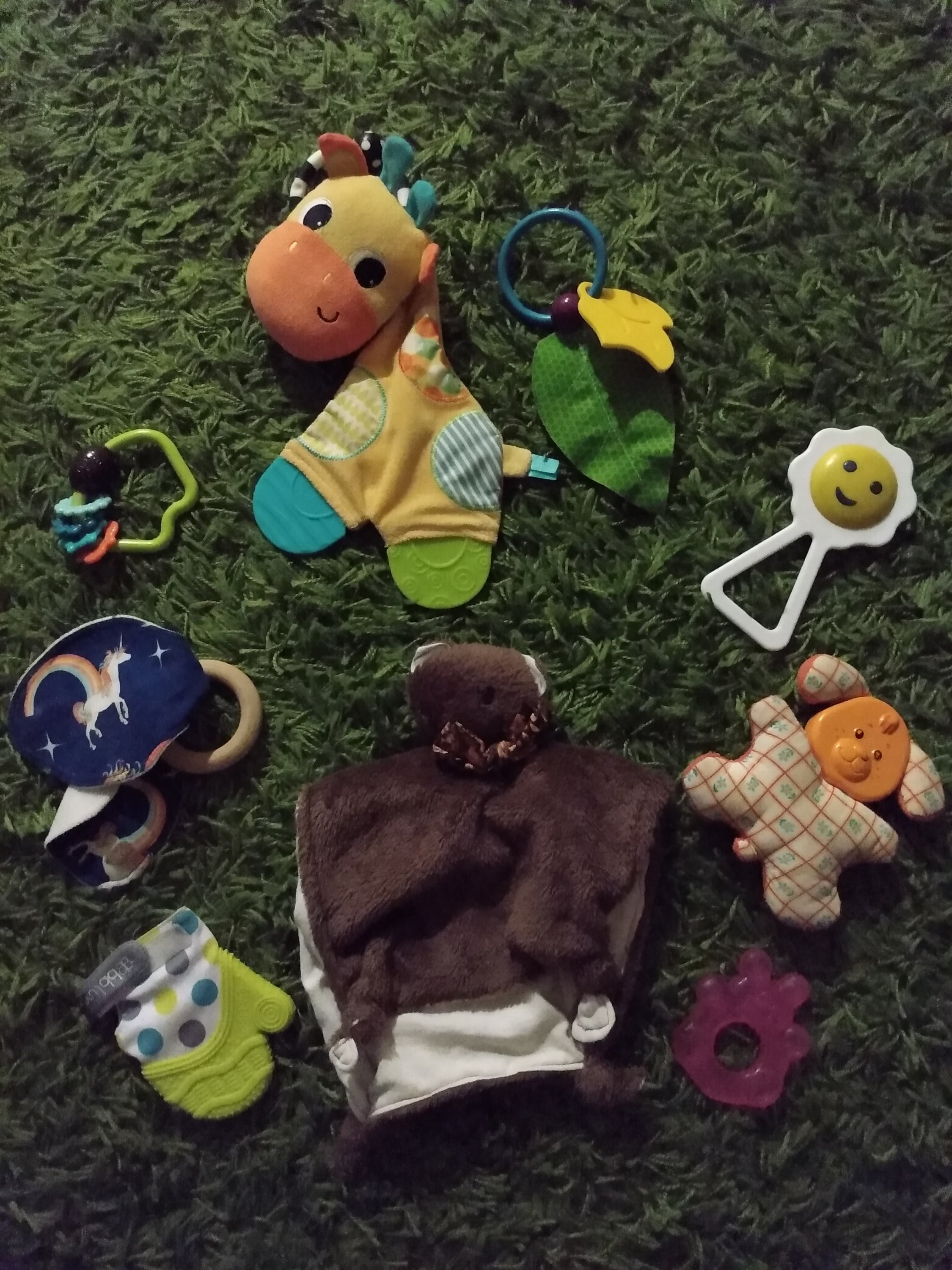 - Teething/chewing/play toys, so many to choose from. You can get small toys or large toys. Many come in different shapes, textures and other toys attached. Many different materials are used to make these, silicone, plastics, cotton, ribbon, wood and more.