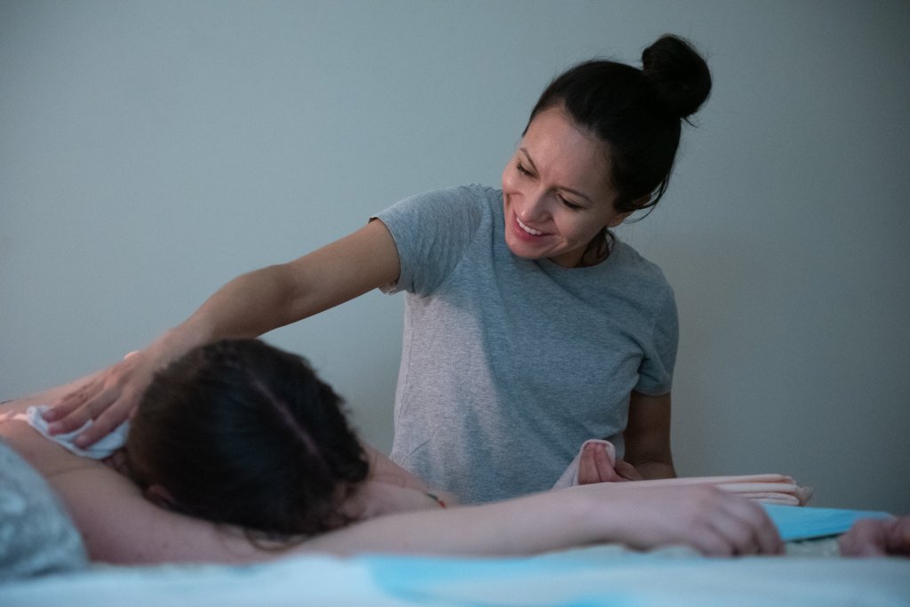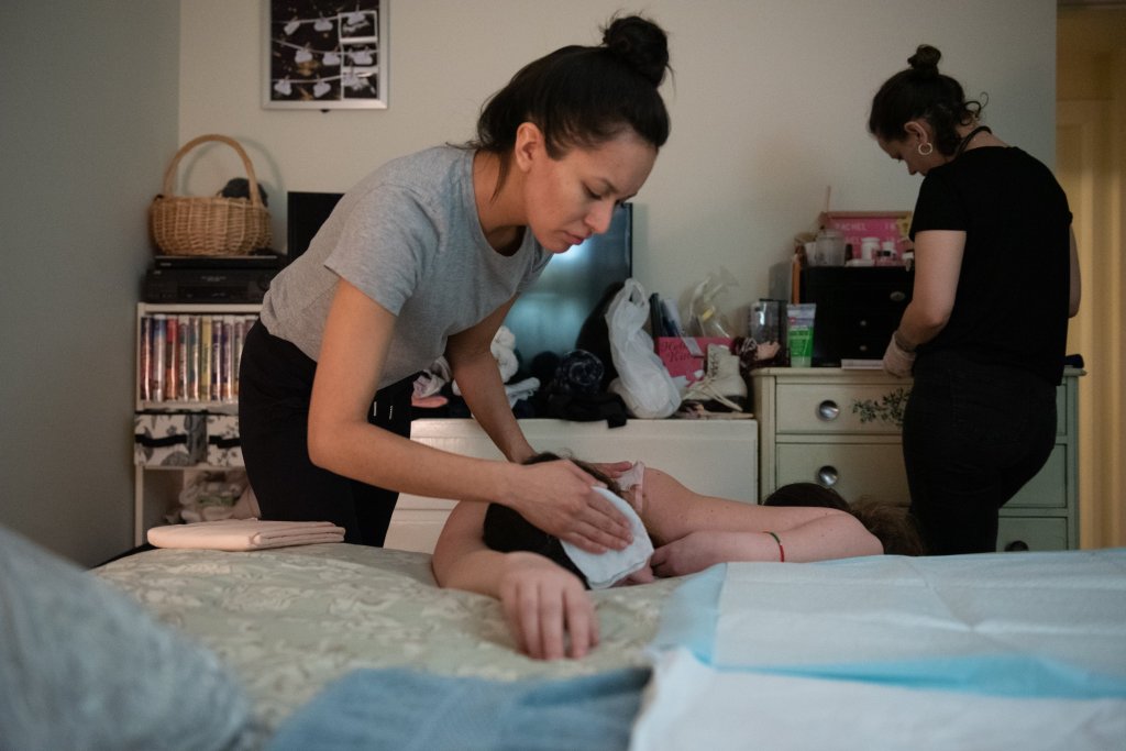 After birthing placenta our midwifes took it into the other room where Rachel then wanted to see it so Midwife Dana helped show her. Rachel also helped Doula Olivia clean up.