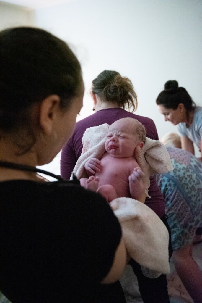 Midwife Dana then took Liam while Midwife Carlie and Doula Olivia helped me onto the bed. We then just waited for the placenta to be birthed. Some skin to skin and family cuddles while waiting. Liam then had his checks and Rachel helped.