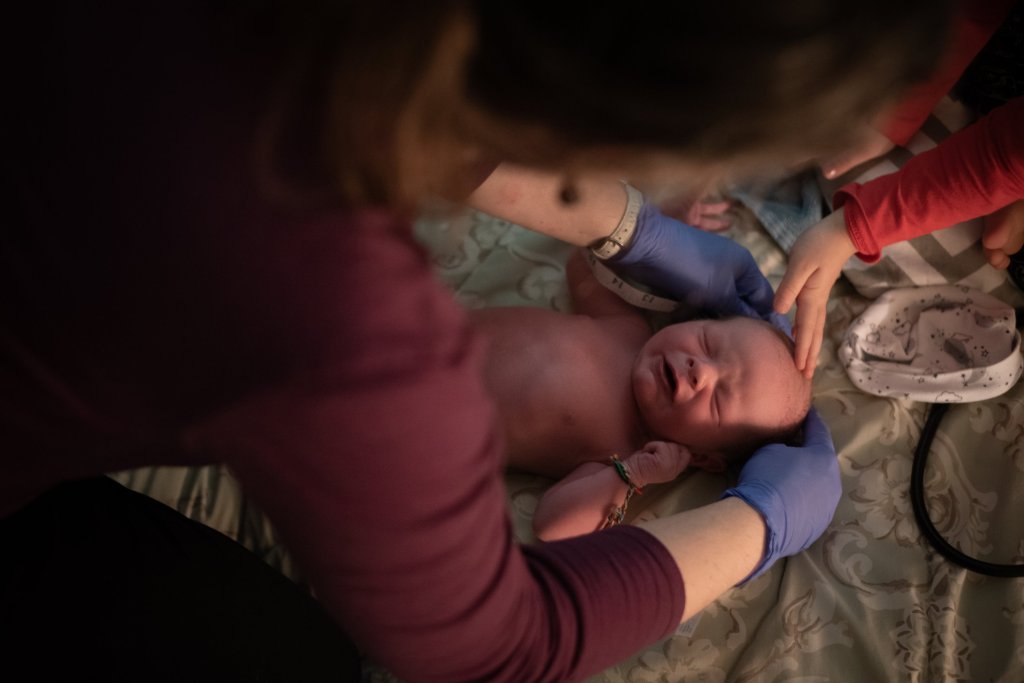 Holding him in my arms immediately all the pain disappeared. My body knew what it needed to do and it was all for this moment. While I was concentrating on what I needed to do everyone around me was helping in many different ways. Once his head started to crown our midwife Dana called to my husband to wake up our daughter who passed out at the 10pm mark. Everyone (except our 1.5 year old) was present for baby’s birth. 12:27am on January 31st 2020 Liam was finally here. Because of being a very quick birth he didn’t get that good squeeze that happens when the end part of birth take some time and had a bit more liquid on his lungs. Our midwife Dana helped with getting that good first cry by performing a massage on him. He let out a fantastic cry quickly after that.